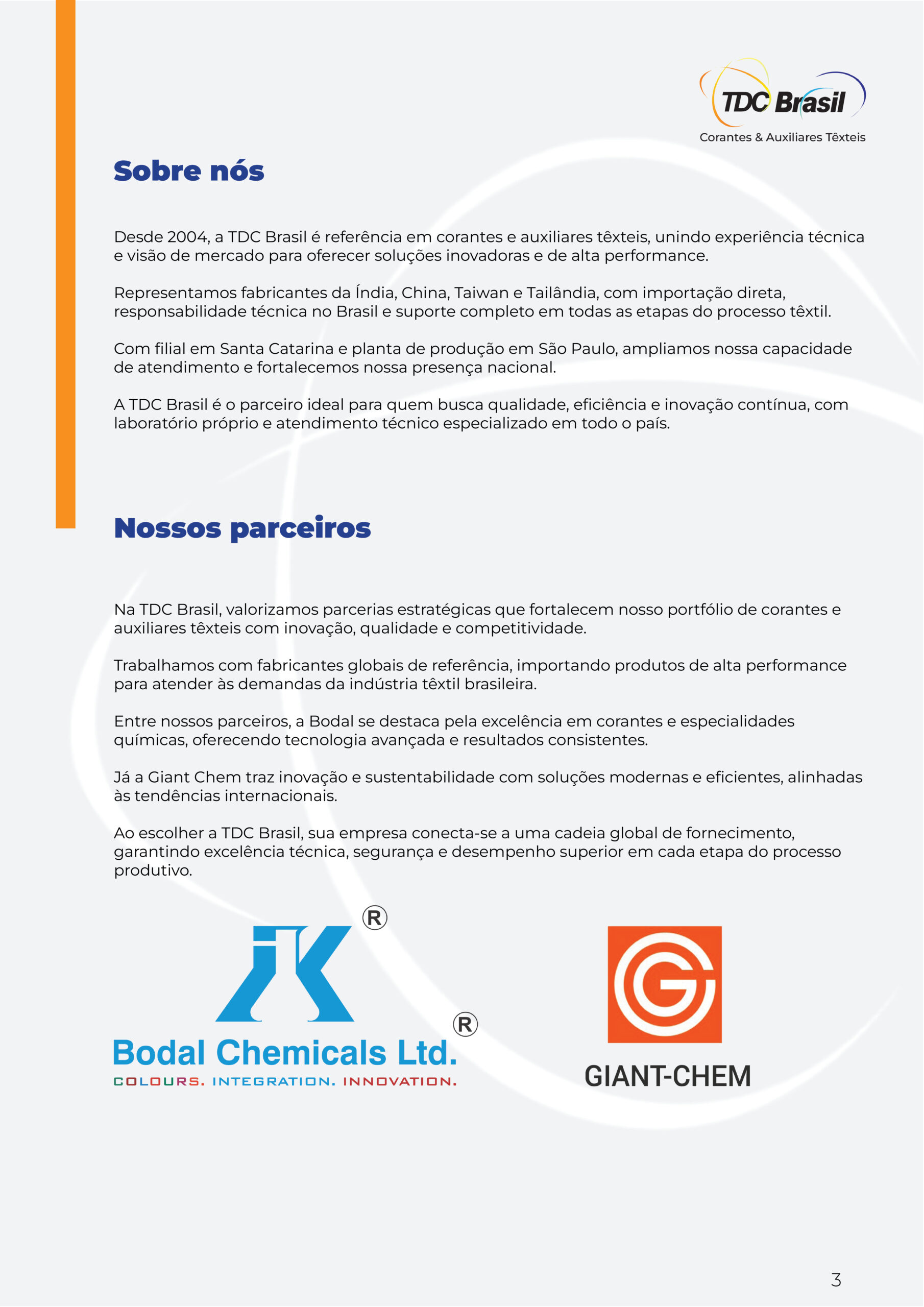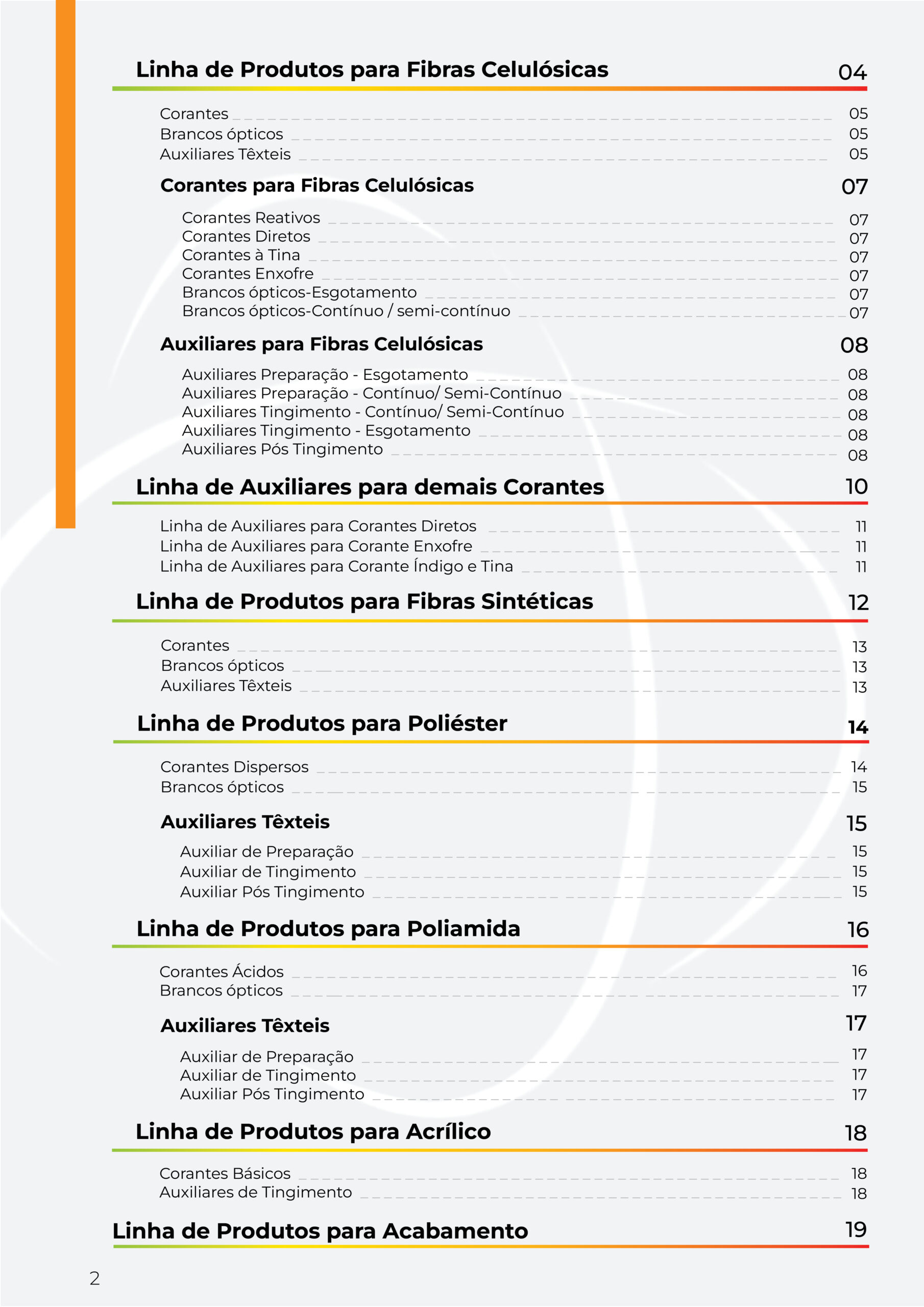 Além do site, a Studio Bolt foi responsável pela criação do catálogo de produtos, organizado de forma clara e profissional para apresentar a linha de corantes e auxiliares têxteis. O material foi desenvolvido com foco técnico e comercial, facilitando a consulta e apoiando o processo de decisão de compra.